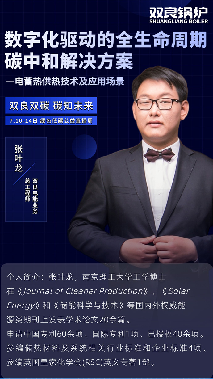 7月11日,雙良鍋爐電能業(yè)務部總工程師張葉龍博士,被特邀作了題為“數(shù)字化驅動下的全生命周期碳中和解決方案-電蓄熱供熱技術及應用場景”的演講。